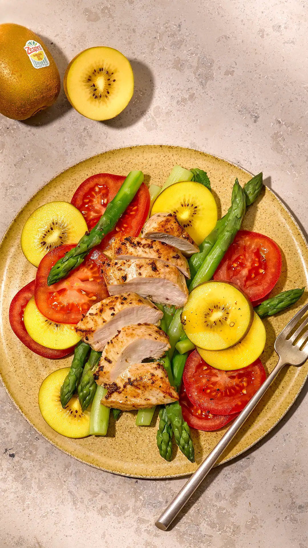 SunGold™ Kiwi-Tomaten-Salat mit grünem Spargel und Hühnchenbrust
