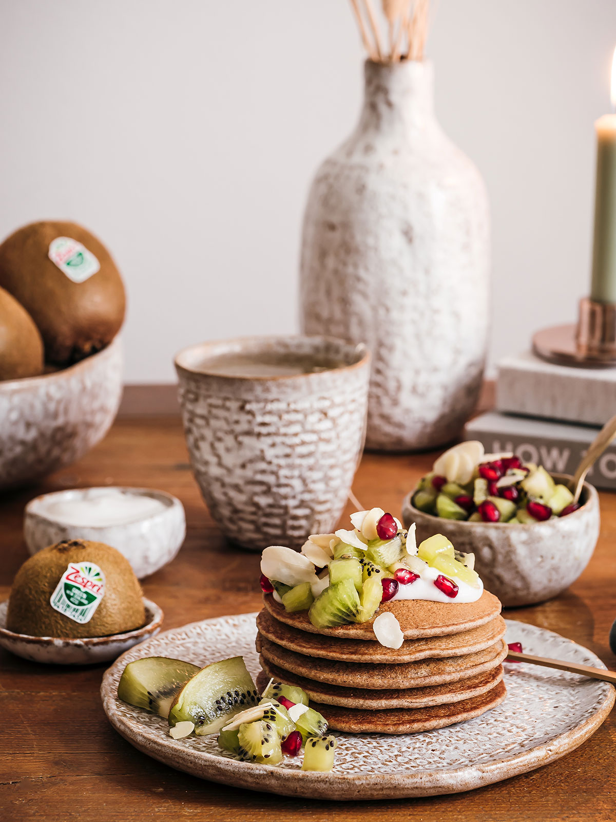 Gesunde Pancakes aus Buchweizen mit Kiwi-Granatapfel-Salat