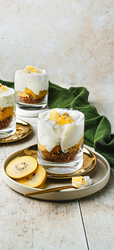 - Kokos-Frischkäsecreme und SunGold™ Kiwi in die Gläser füllen. No Bake Kiwi-Kokos-Cheesecake nach Belieben mit mehr Kiwis und Kokosflocken garnieren und geniessen.