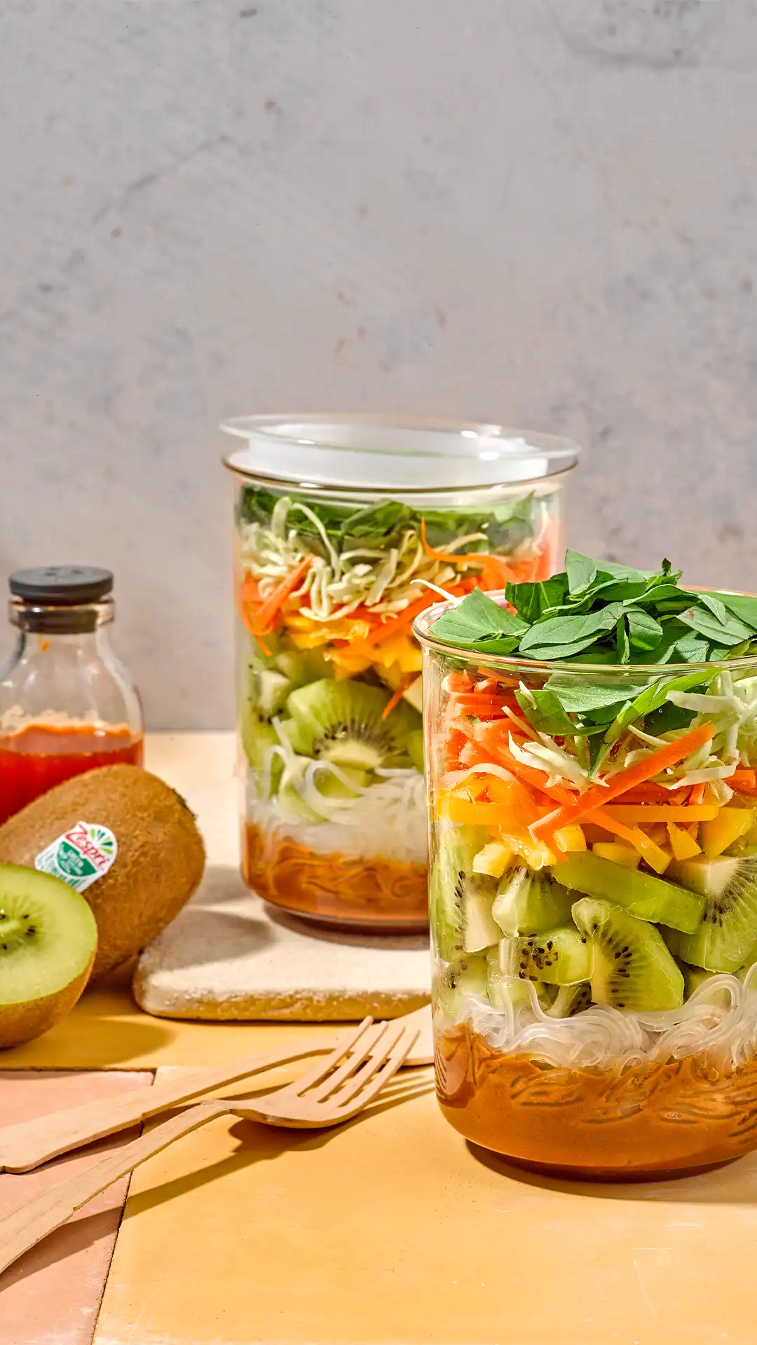 Zwei Meal-Prep-Gläser oder Schüsseln zuerst mit Erdnusssauce und Glasnudeln befüllen.