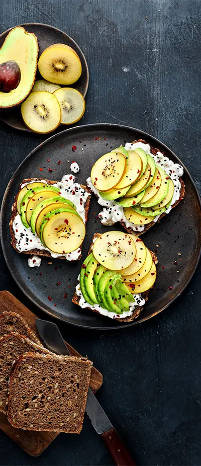 - Mischbrot mit Hüttenkäse, Kiwi und Avocado belegen, mit Sesamsamen und Chiliflocken garnieren und genießen.