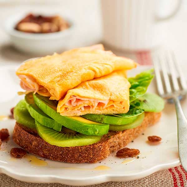 - Brotscheiben erst mit Kiwi- und Avocadoscheiben, dann mit etwas grünem Salat belegen und als letztes das Omelett oben drauf anrichten. Mit Rosinen bestreut servieren.