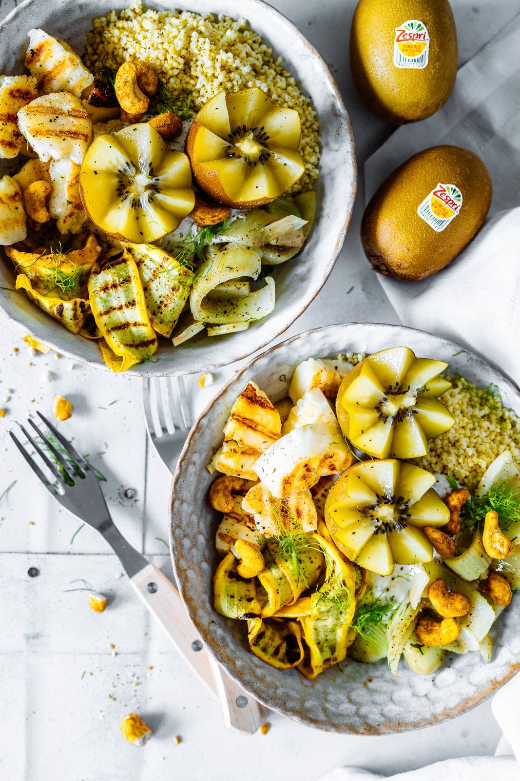 Golden Bowl mit Hirse, Zucchini, Fenchel, Halloumi und Zespri™ SunGold Kiwi