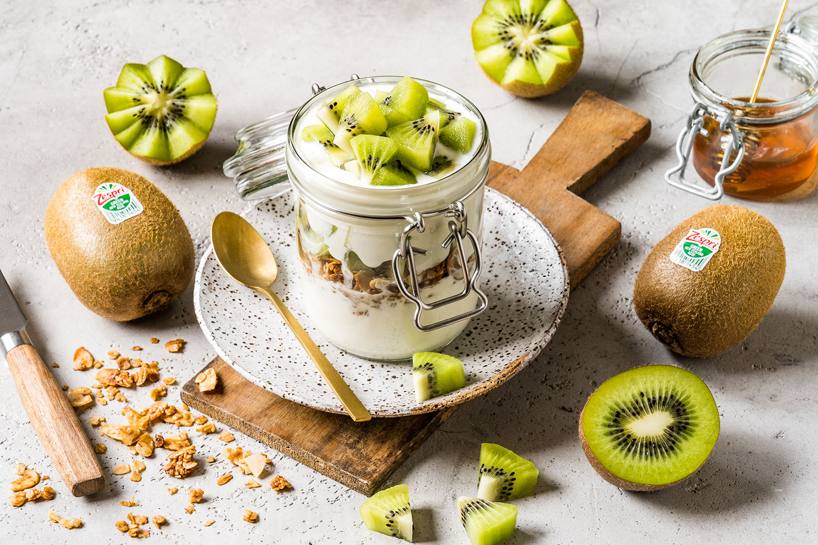 - Joghurt und Honig verrühren, Kiwis schälen und in Stücke schneiden.