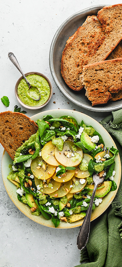 - Babyspinat, Avocado, SunGold™ Kiwi und Feta auf einem Teller anrichten, mit Kiwi-Minz-Dressing beträufeln, Walnüssen garnieren und mit geröstetem Brot servieren.