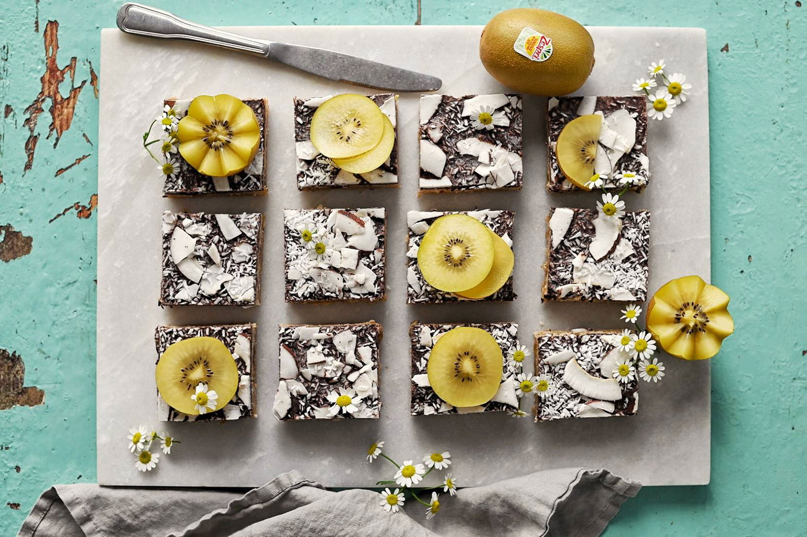 Dann den Fruchtaufstrich in einem Topf leicht erhitzen und auf der Müslimasse verstreichen. Die Zespri SunGold Kiwis waschen und in Scheiben schneiden. Bis auf eine Kiwi alles auf der Feigenmarmelade verteilen. Dann die restliche Masse darauf verteilen und wieder andrücken.