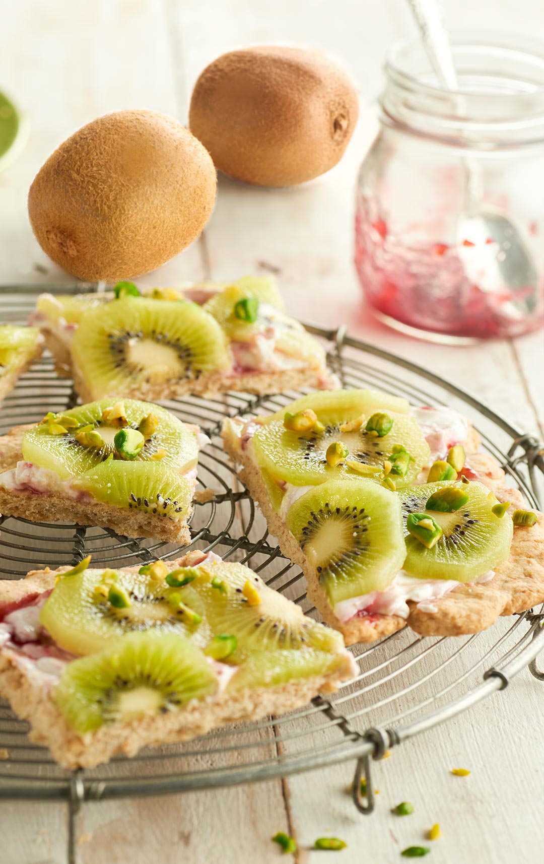 - Die Mascarpone-Masse auf dem Kuchenboden verteilen. Die erwärmte Erdbeermarmelade darüber streichen und mit den Kiwischeiben belegen. Mit den gehackten Pistazien garnieren.