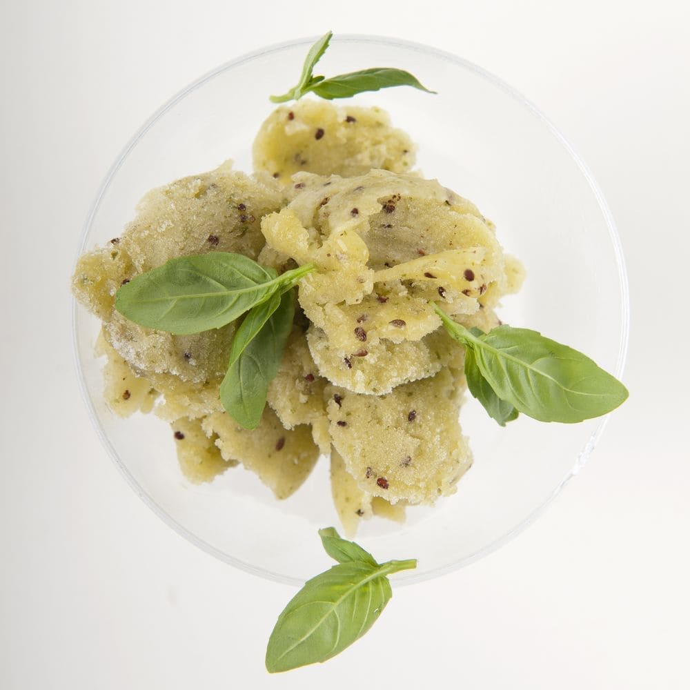 - Die Granita auf vier eiskalte Gläser verteilen und mit ein paar Blättern Basilikum garnieren.