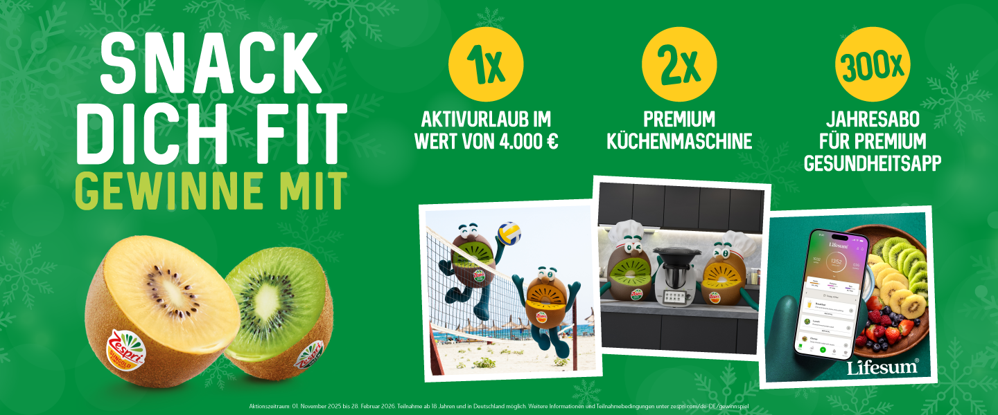 Zespri™ Kiwis möchte dich diesen Winter dabei unterstützen, gesunde Gewohnheiten ganz leicht in deinen Alltag zu integrieren. Dafür verlosen wir attraktive Preise: Ein Aktivurlaub als Hauptgewinn, zwei Premium-Küchenmaschine zum Kochen von schnellen, gesunden Gerichten und 300x Jahresabos für die Ernährungs-App Lifesum, die dich dabei unterstützt, deine Ernährungsziele zu erreichen.