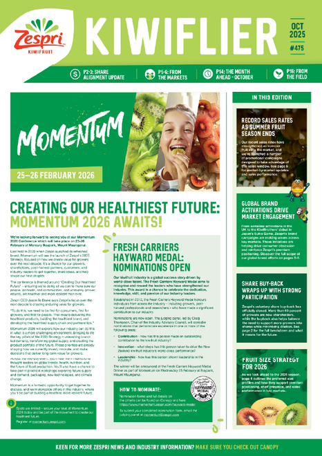 Articles include: an update on Zespri’s upcoming Momentum 2026 Conference, Jason’s CEO column, detail on our preferred fruit size for 2026, detail on the share buy-back and more