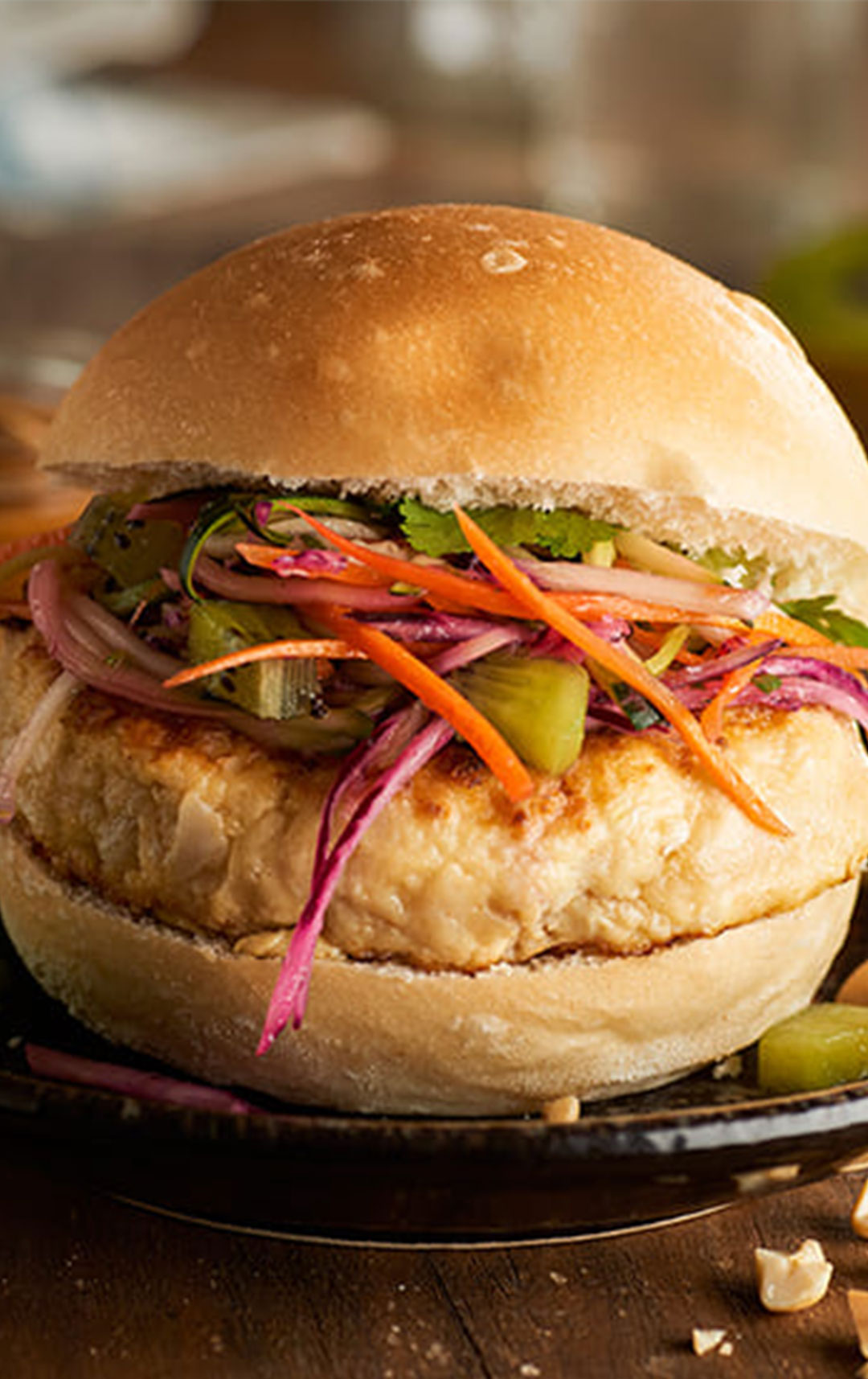 - To serve, place the burgers on the buns, top with salad and spoon over some of the sauce.