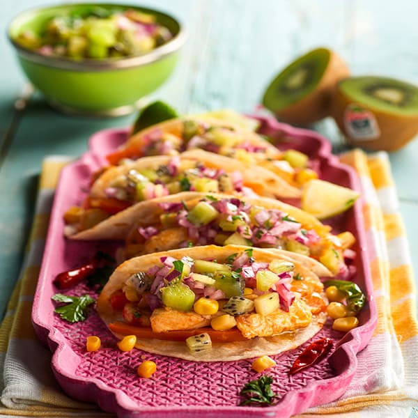 - Fill the tortillas with the mix from the pan and top with diced Zespri Green kiwifruit and sweetcorn. Top with the coriander sauce and a few chopped leaves of fresh coriander. Serve right away.