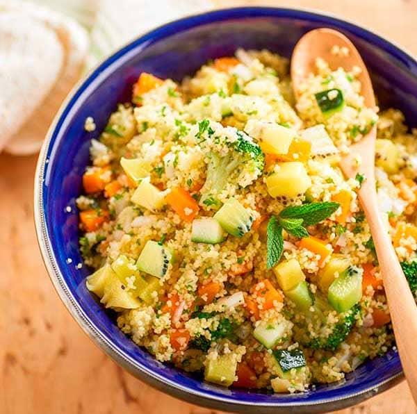 - Put the couscous into boiling water with half a teaspoon of salt, following the instructions on the packet. Leave to cool.
