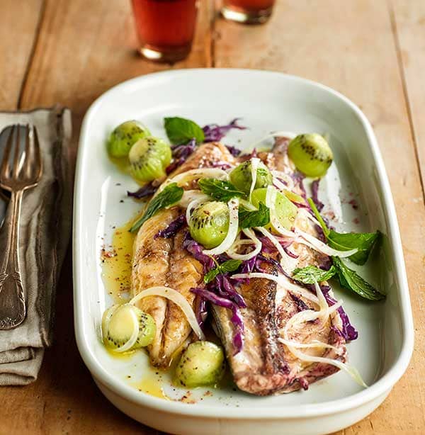 - Serve the mackerel fillets garnished with sautéed cabbage and topped with the kiwifruit and spring onion mixture. Perfect with some baby new potatoes