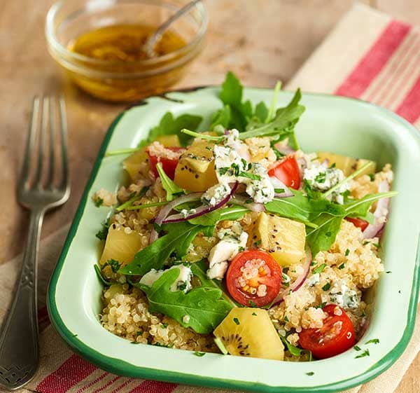 - Combine the quinoa, rocket, kiwifruit, onion, tomatoes and parsley in a large bowl then add the dressing. Combine well. Serve in a large dish or on plates with cheese sprinkled on top.
