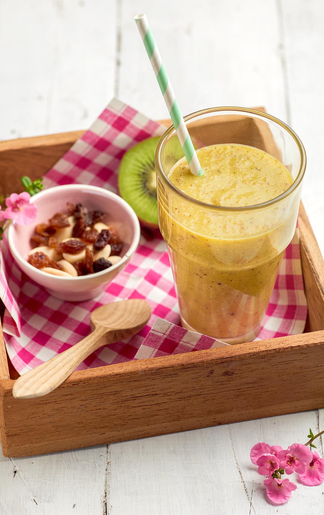 - Add the yoghurt, peeled and chopped Zespri Green kiwifruit, mango flesh, raisins, honey and mineral water. Blend until smooth. Serve in large glasses.