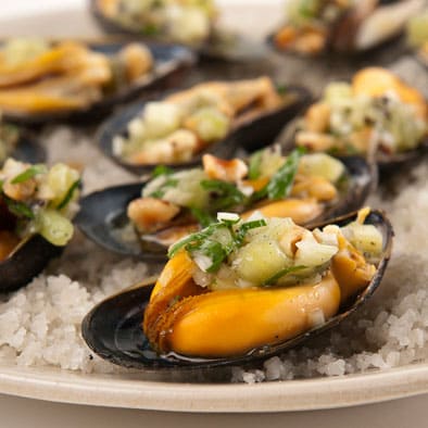- Divide the vinaigrette over the mussels. Serve immediately.