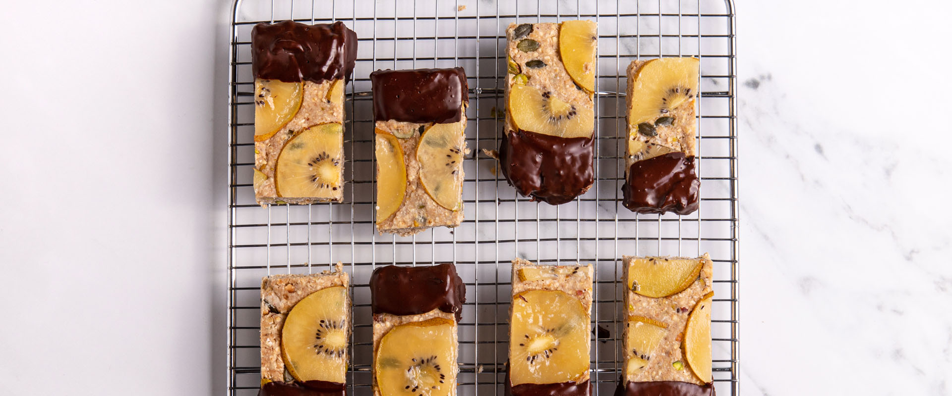 - Line a square baking tin with parchment paper and transfer the mix into the tin. Spread out evenly with the back of a metal spoon. Using the same spoon, make small indentations in the mix to place a slice of kiwi in each one.