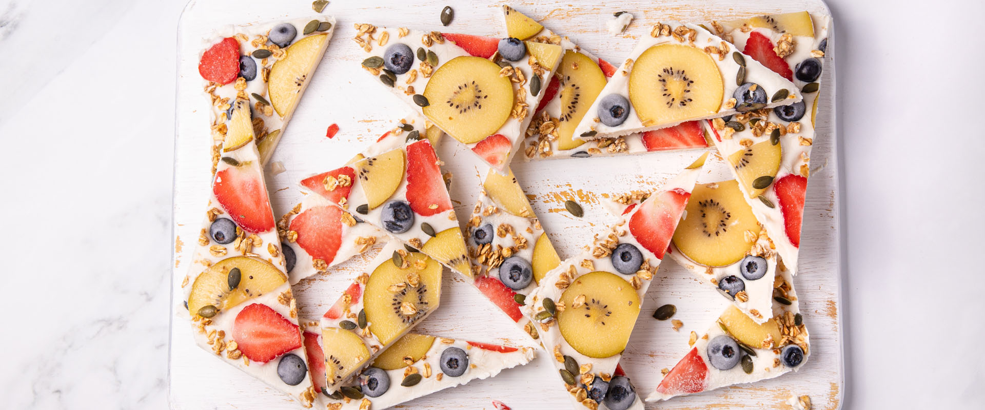 - Scatter over the sliced Zespri™ SunGold™ kiwis. Add berries. (If using strawberries, slice them).