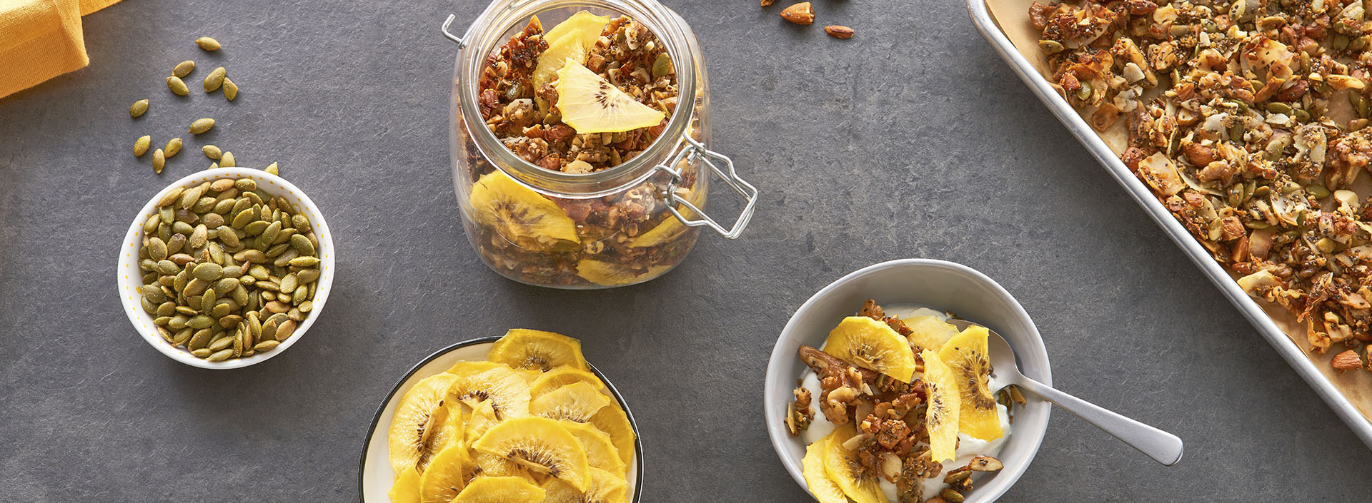 - Dehydrate for 18 hours your Zespri™ kiwifruit ahead of time. Fresh Zespri™ kiwifruit baked with the granola will burn. Alternatively, you can serve the baked granola with fresh sliced Zespri™ kiwifruit if desired.