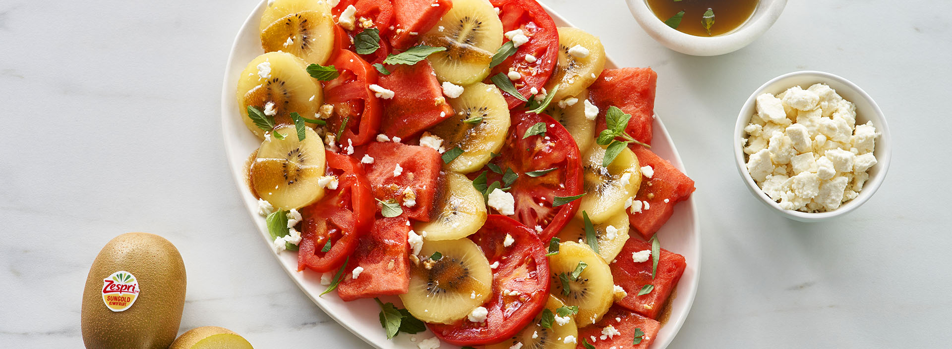 - Place 4 squares watermelon on each salad plate. Layer 4 slices tomato and 4 slices Zespri kiwifruit over melon. Drizzle half of vinaigrette over kiwifruit. Mix remaining vinaigrette with feta cheese and herbs and sprinkle over Zespri kiwifruit. Serve immediately.