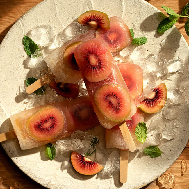 - Now, take a popsicle mould and add two slices of Zespri RubyRedTM Kiwifruit in it. Once done, carefully transfer the prepared kiwi-fruit juice mixture into the mould.