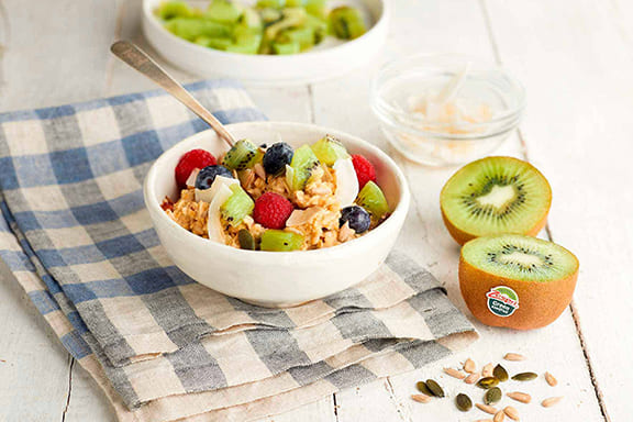 - Pela y corta a en dados el kiwi Zespri® y añádelo al bol.