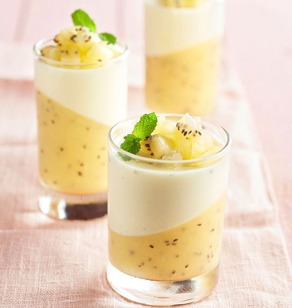 - Para la gelatina de kiwi Zespri: empapa las hojas de gelatina en agua fría durante 5 minutos. Pela y corta el kiwi, colócalo en una sartén con agua y llévalo a ebullición. Tritura, añade la gelatina escurrida y un poco de zumo de limón y vierte en vasos colocados sobre una bandeja. Deja en el frigorífico durante 2-3 horas hasta que quede consistente.