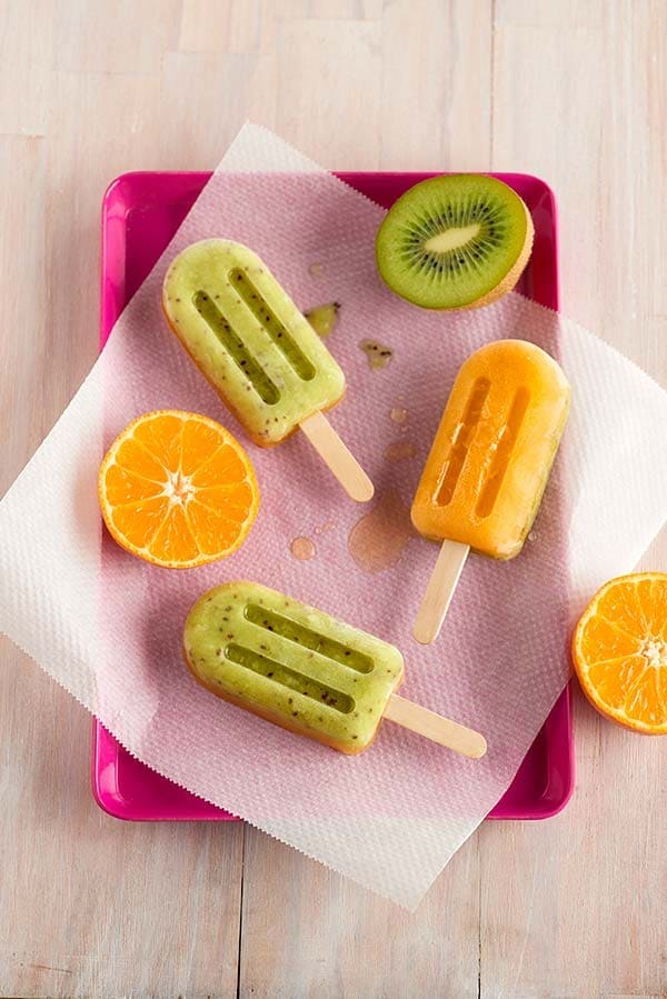 - Llena los moldes de polo hasta la mitad con el puré de kiwi y mételos en el congelador hasta que se endurezcan. A continuación, llena el resto con el zumo de mandarina y vuelve a congelarlos hasta que estén listos para servir.