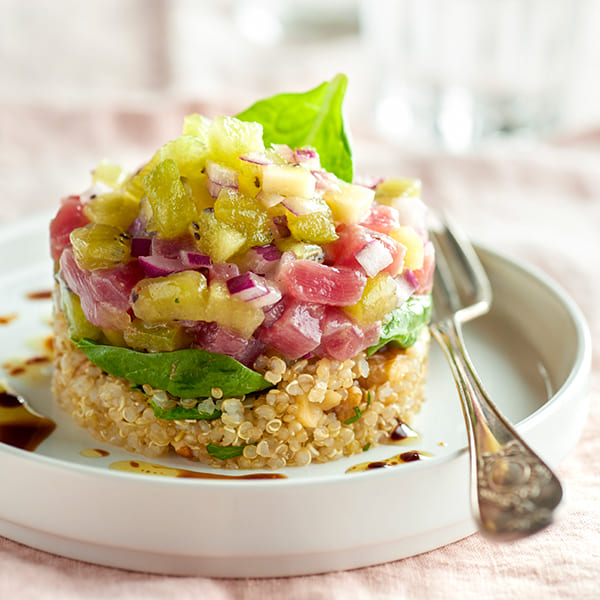 - Con ayuda de un anillo metálico, forma la base con la quinoa y coloca el atún y el marinado encima. Acaba con más cubos de kiwi y con unas hojas de cilantro.