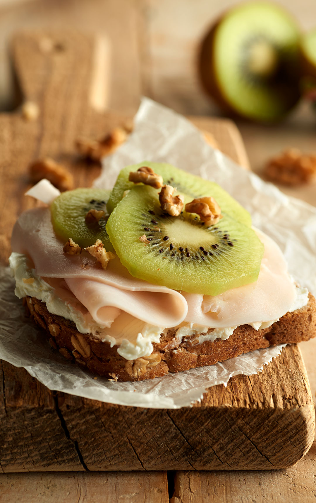 - Cubre las rebanadas con el jamón de pavo asado y las lonchas de kiwi. Sirve enseguida.