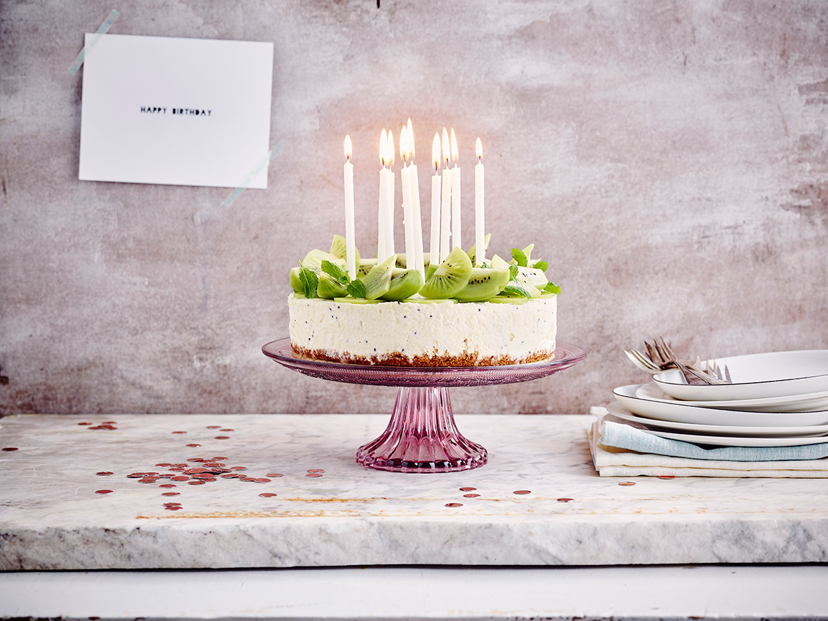 Gâteau d’anniversaire : Cheesecake au kiwi avec une croûte sablée au pécan