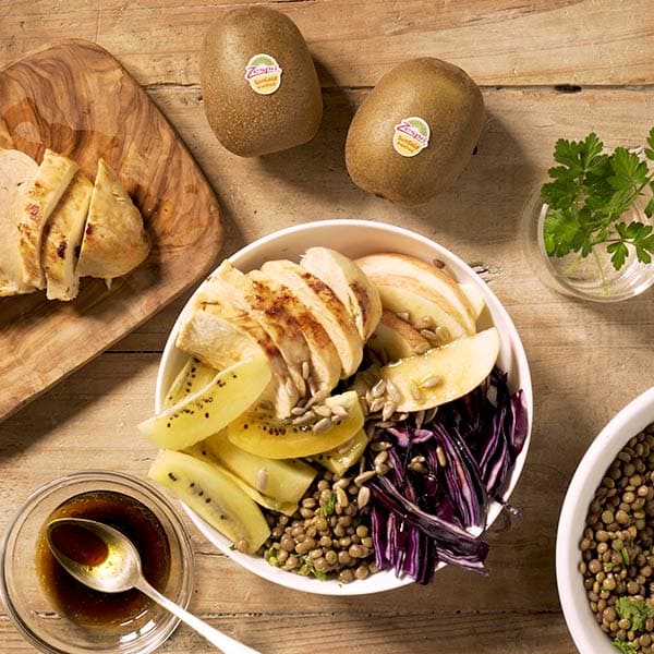 Bol flexitarien : salade de lentilles au kiwi, pomme, chou rouge, graines de tournesol et poulet