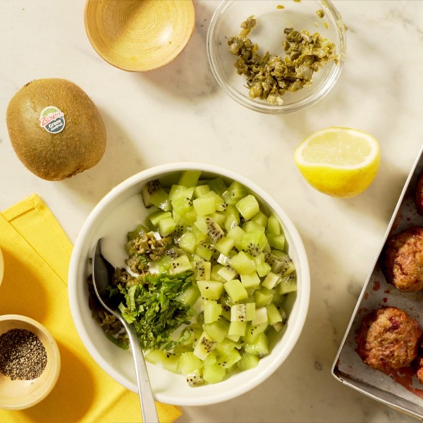 - Pelez et coupez le kiwi en dés. Mélangez les dés de kiwis Zespri avec le yaourt, les câpres et la menthe hachée. Ajouter un filet de jus de citron, du sel et du poivre. Remuez et servez dans un bol avec les boulettes de viande.