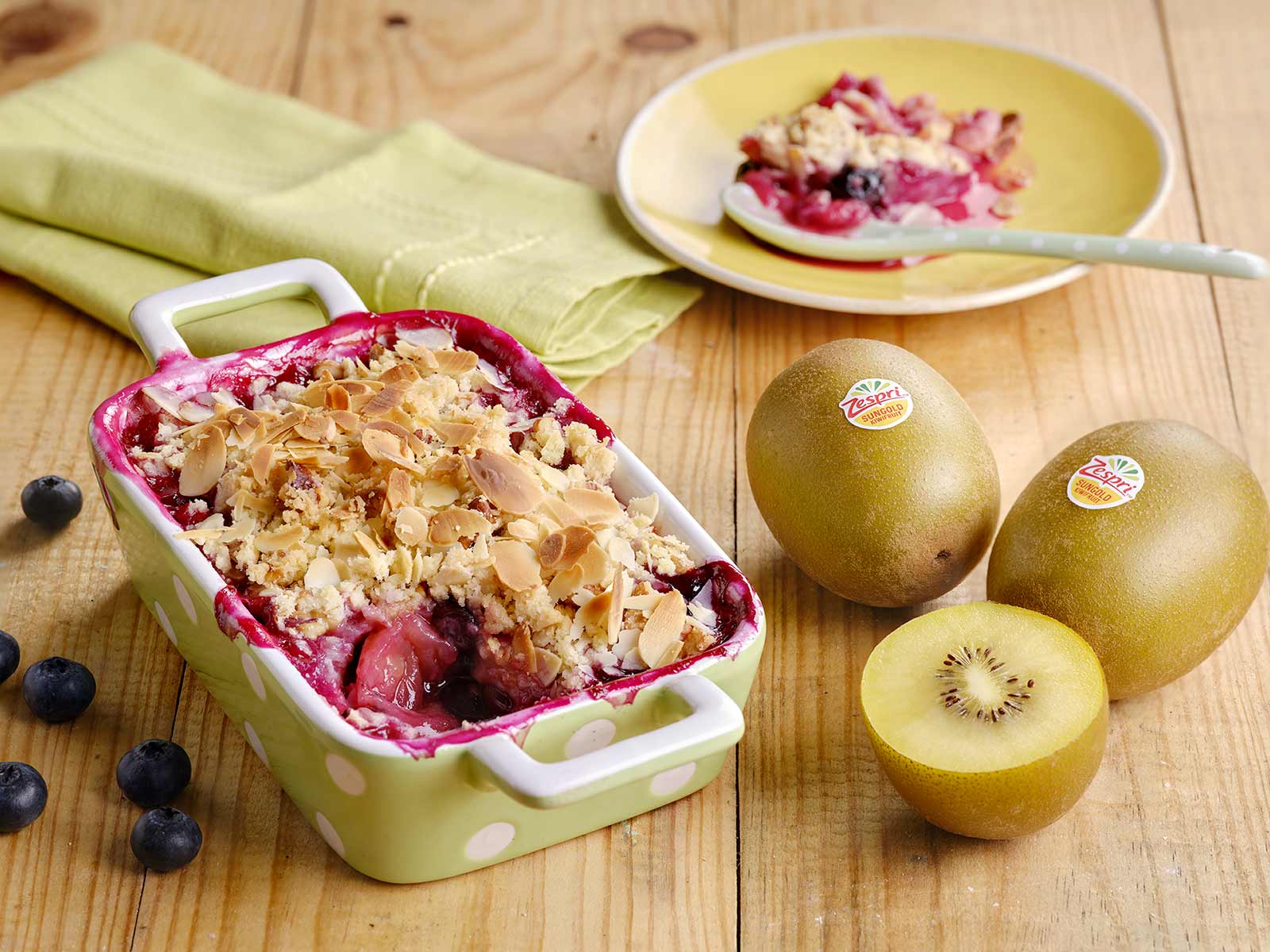 - Placez les kiwis Zespri SunGold et les baies dans une petite casserole avec le jus d'orange et la moitié du sucre. Faites cuire à petit feu pendant 3-4 minutes. Mettez de côté.