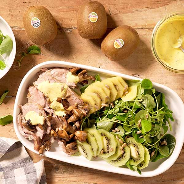 - Épluchez et coupez le kiwi Zespri en tranches et disposez-les dans un plat avec les feuilles d'épinard et le cresson. Ajoutez l'agneau en tranches, les champignons et un peu du jus de cuisson.