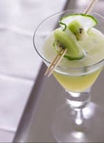 - Versez la boisson obtenue dans 2 verres glacés, que vous pouvez garnir de rondelles de kiwi et de concombre.