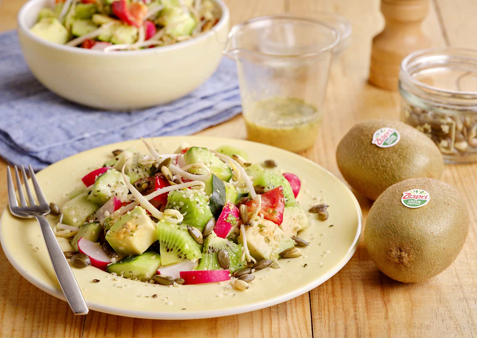 - Pelez et coupez en dés les kiwis Zespri™. Coupez l’avocat en deux, enlevez le noyau et séparez la peau en un seul morceau à l'aide d'une cuillère. Découpez en cubes de 1 cm.