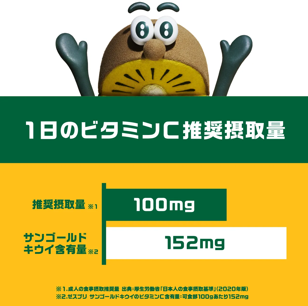 ビタミンKといえば、緑色野菜や納豆を思い浮かべる方もいるかもしれませんが、実はキウイにも含まれています。摂取の目安量は成人男女とも1日あたり150μg*で、ゼスプリ・グリーンキウイには15μg、ゼスプリ・サンゴールドキウイには7μgのビタミンKが含まれています。
