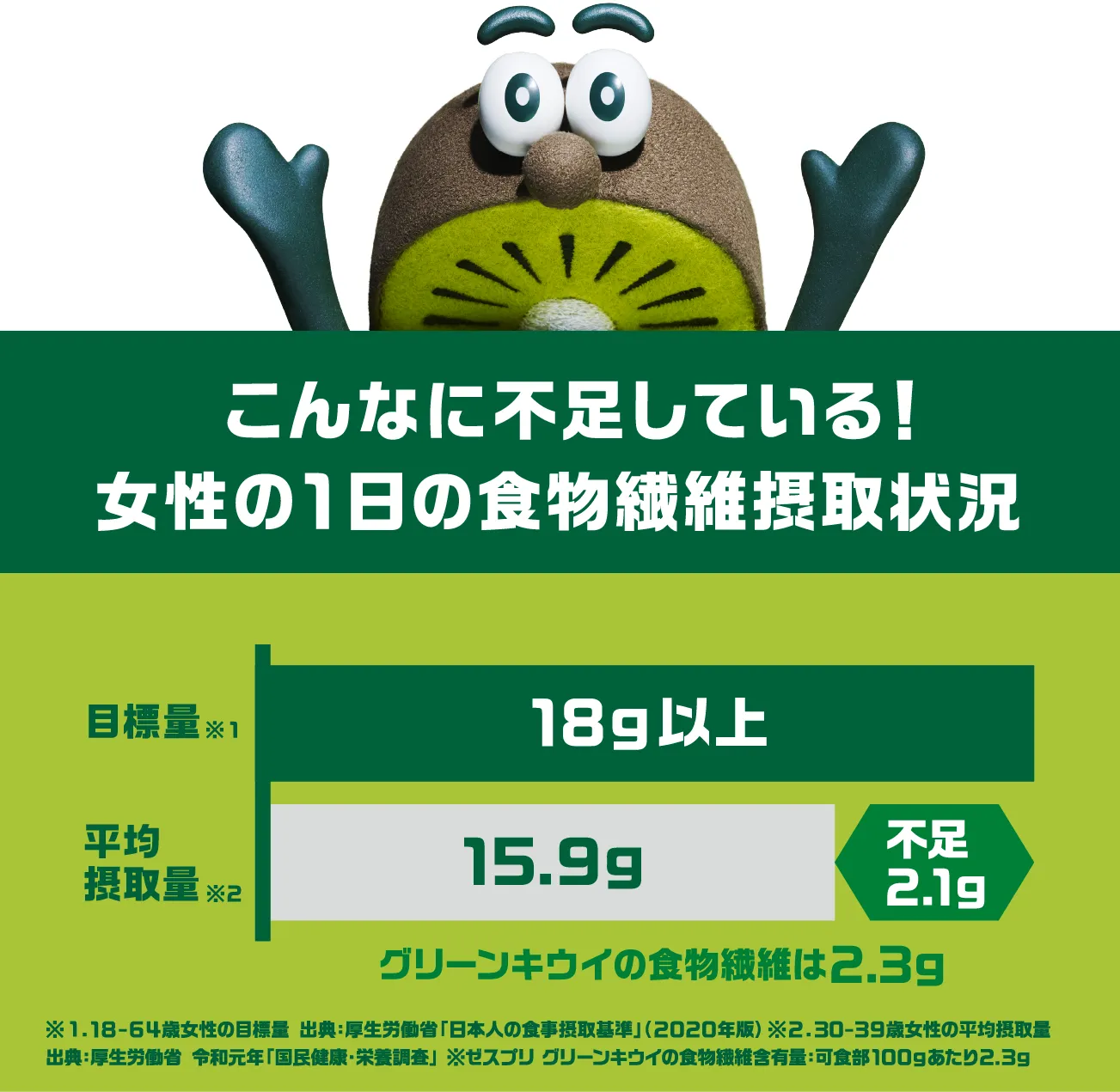 グリーンキウイには、現代人に不足しがちな食物繊維がたっぷり。食物繊維の摂取目標量は、成人女性なら1日18g以上*。でも令和元年の調査では、平均15.9gしか摂取できていないとか。グリーンキウイには可食部100gあたり2.3gもの食物繊維が含まれているから、1個で不足分を補うことができます。
