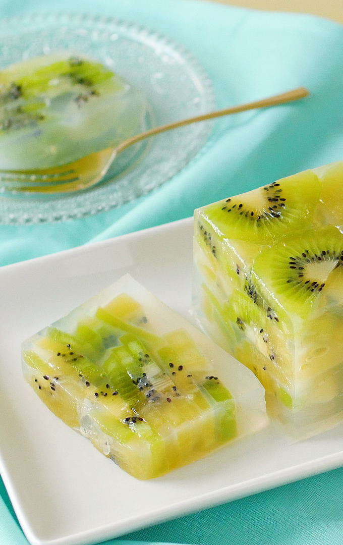 キウイは酵素があるためゼラチンでは固まりにくいので寒天ゼリーに。食感をゼリーに近いものに仕上げたいときはアガーを使うのがおすすめです。