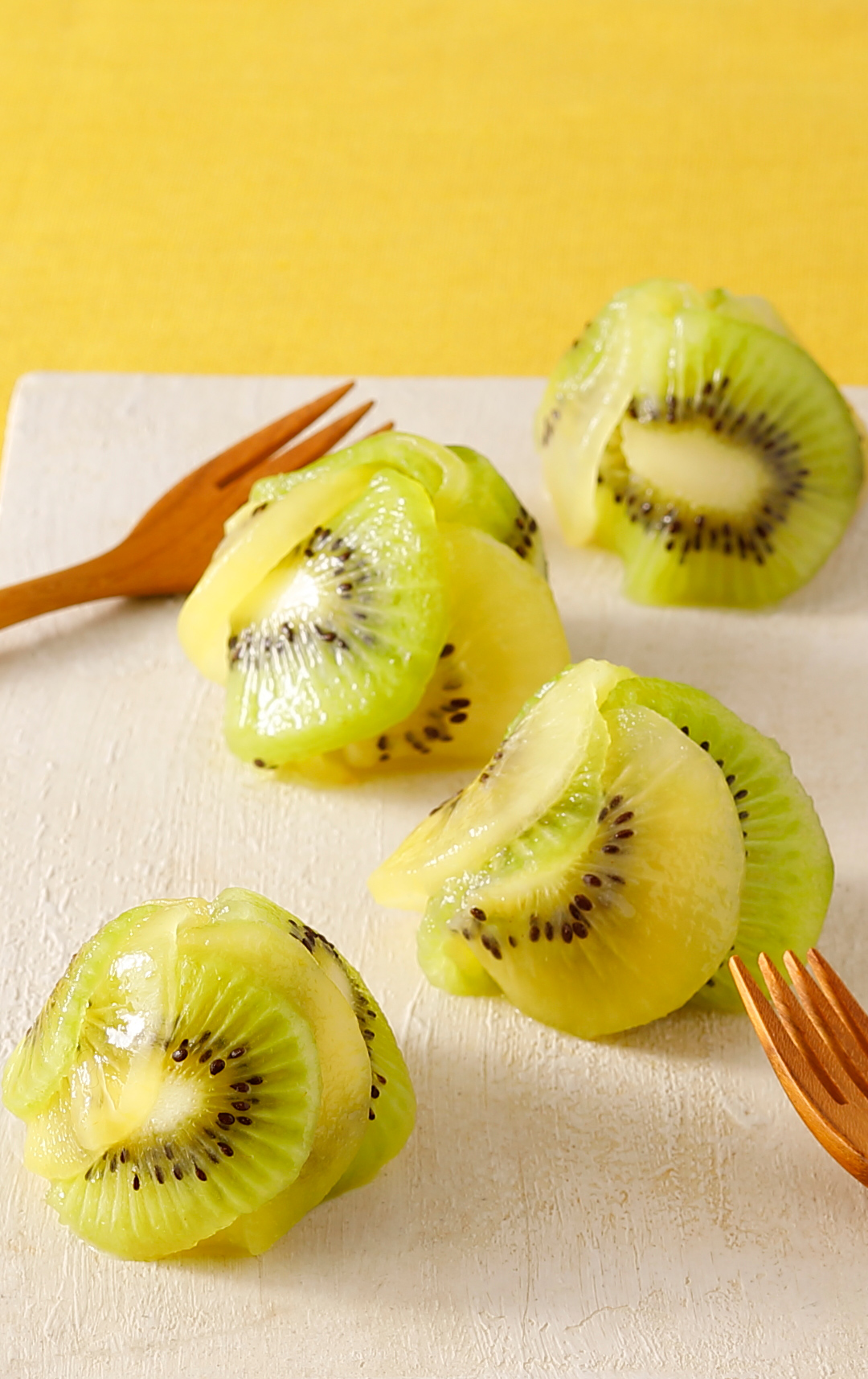 1)キウイは皮をむき、薄切りにする。