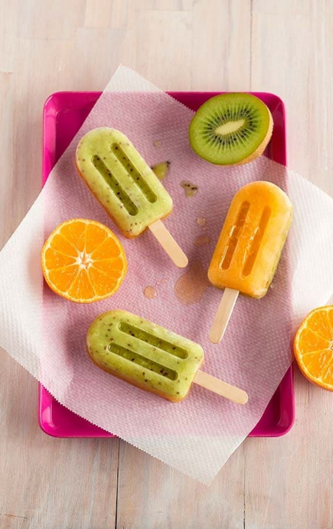 - Fyll ispinneformene halvveis med kiwipuré og sett dem i fryseren til de er harde. Fyll deretter opp med klementinsaft og frys dem igjen til de skal serveres.