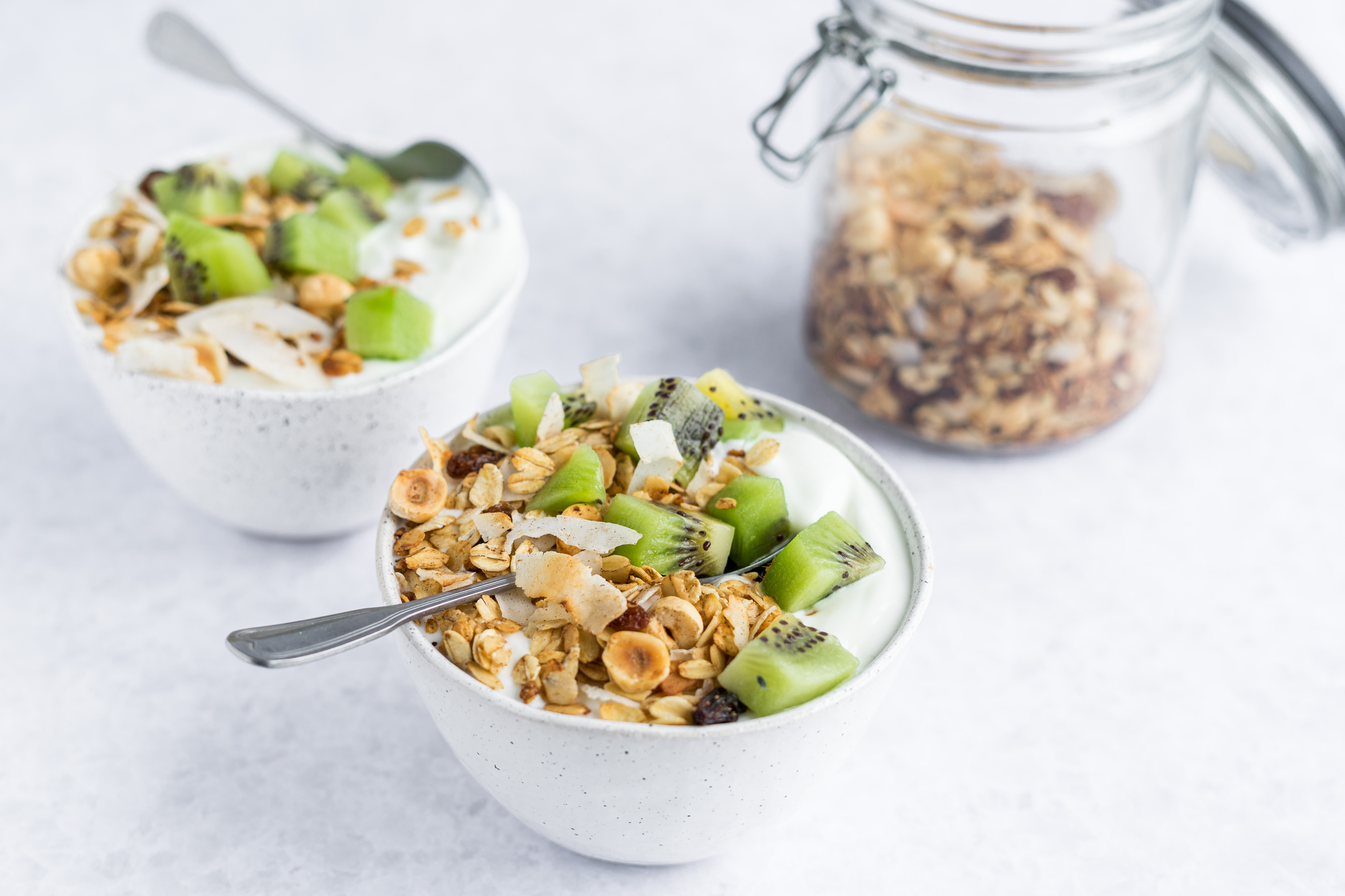 - Verdeel de yoghurt over de bowls. Serveer met de muesli en garneer met de blokjes kiwi.