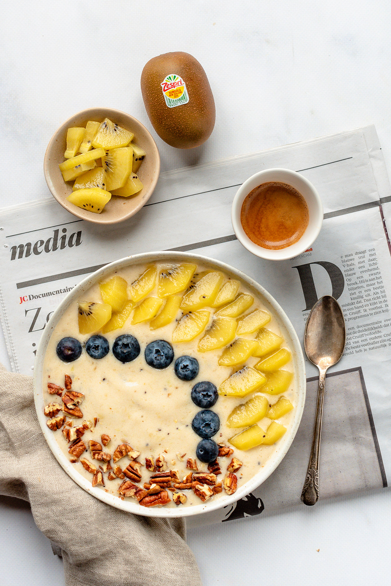 Frozen smoothiebowl met Zespri SunGold kiwi, banaan en blauwe bessen
