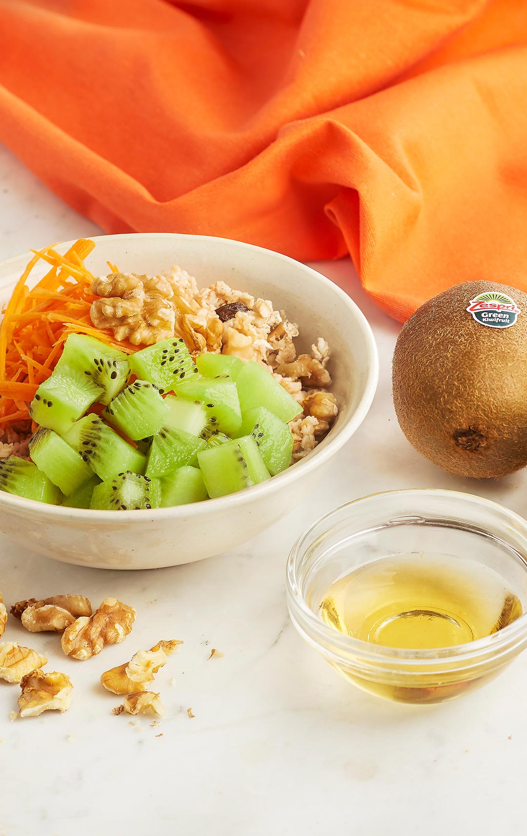 - Doe de havermout in 4 kommen en voeg de kiwi, de wortelen, de noten en de agavenectar toe.