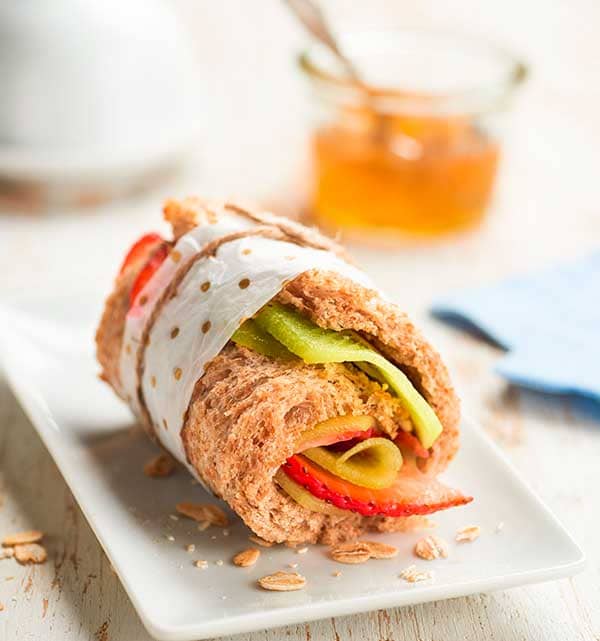 - Maak een sneetje brood plat met een deegrol en besmeer het met margarine. Bestrooi het brood met havermout en bedek het met fruit. Overgiet met een beetje honing en rol op.