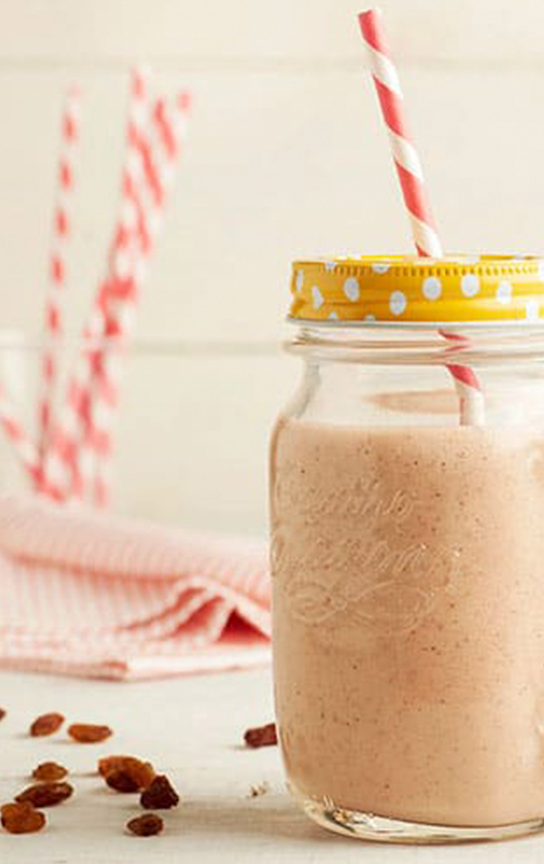 - Doe de kiwi, de aardbeien, de amandelmelk en de rozijnen in de blender. Mix tot een gladde smoothie. Bewaar in een glazen kan in de koelkast en trek erop uit!