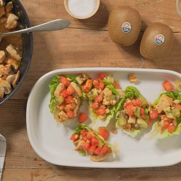 - Leg de bladeren op een bord, vul ze met kip en werk af met tomaat en kiwi.
