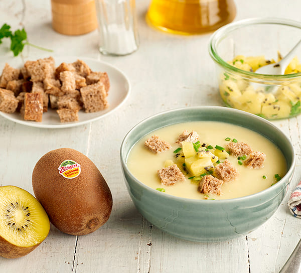 - Schil de Zespri SunGold kiwi’s en snij ze in blokjes. Meng met de fijngehakte bieslook, de peterselie en het zout. Dien de vichyssoise koud op en serveer met brood.